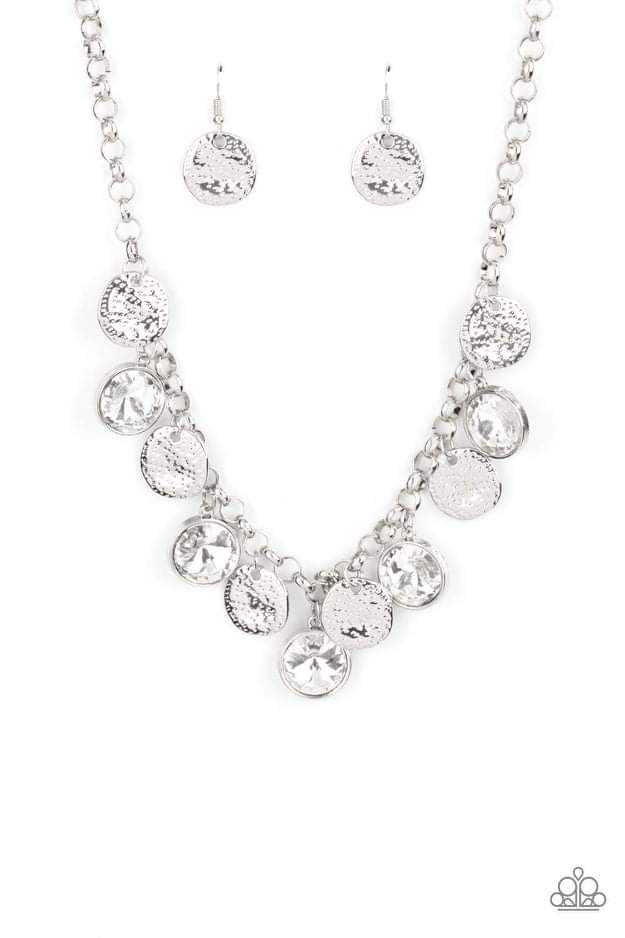 A blinding collection of hammered silver discs and oversized white gems swing from the bottom of a bold silver chain, creating noise-making sparkle below the collar. Features an adjustable clasp closure.