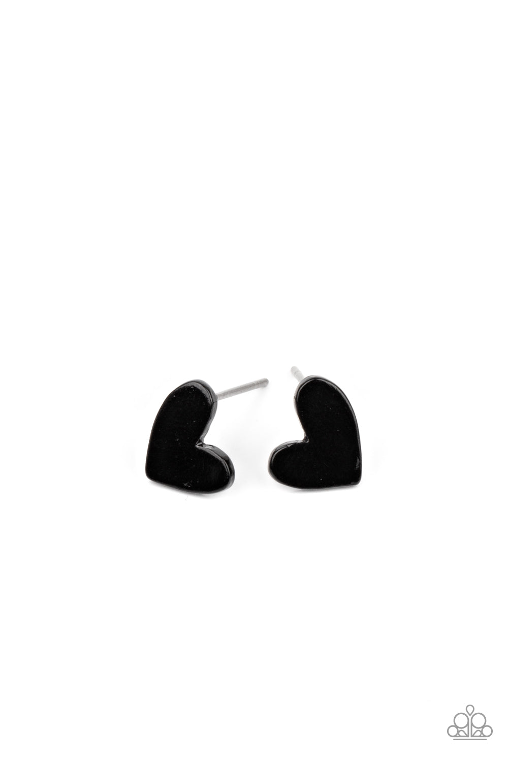 Ten pairs of earrings with heart frames that vary in shades of purple, red, pink, green, black, yellow, and blue. Earrings attach to standard post fittings.