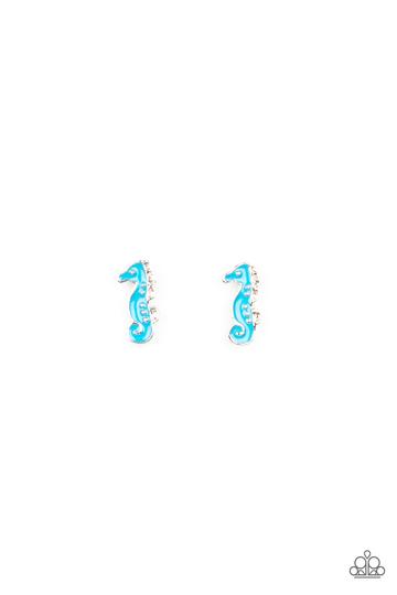 Five pairs of earrings in assorted colors and shapes to be retailed at $1 per pair. Varying in color, the summer inspired frames include, palm trees, seahorses, fish, flamingos, and seashells. Earrings attach to standard post fittings.