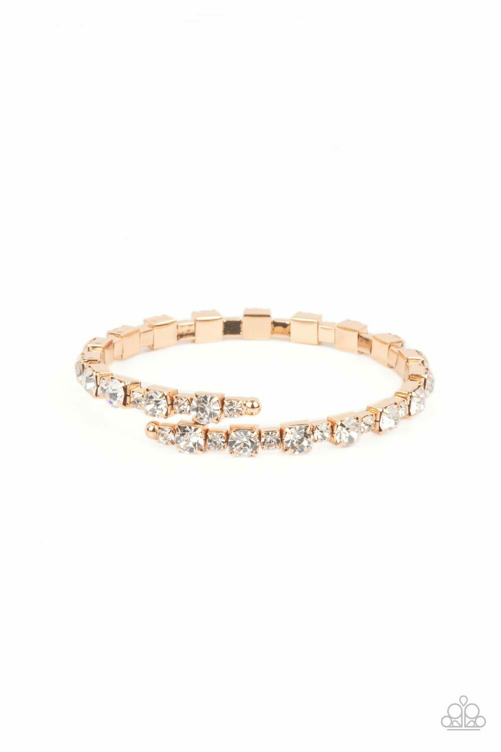 Featuring gold square fittings, dainty and classic white rhinestones delicately alternate along a flexible wire, coiling into a glamorous centerpiece around the wrist. Sold as one individual bracelet.