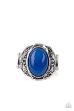 An oversized lapis lazuli stone is pressed into the center of a thick silver frame embossed in antiqued tribal inspired patterns, creating an enchanting centerpiece atop the finger. Features a stretchy band for a flexible fit.